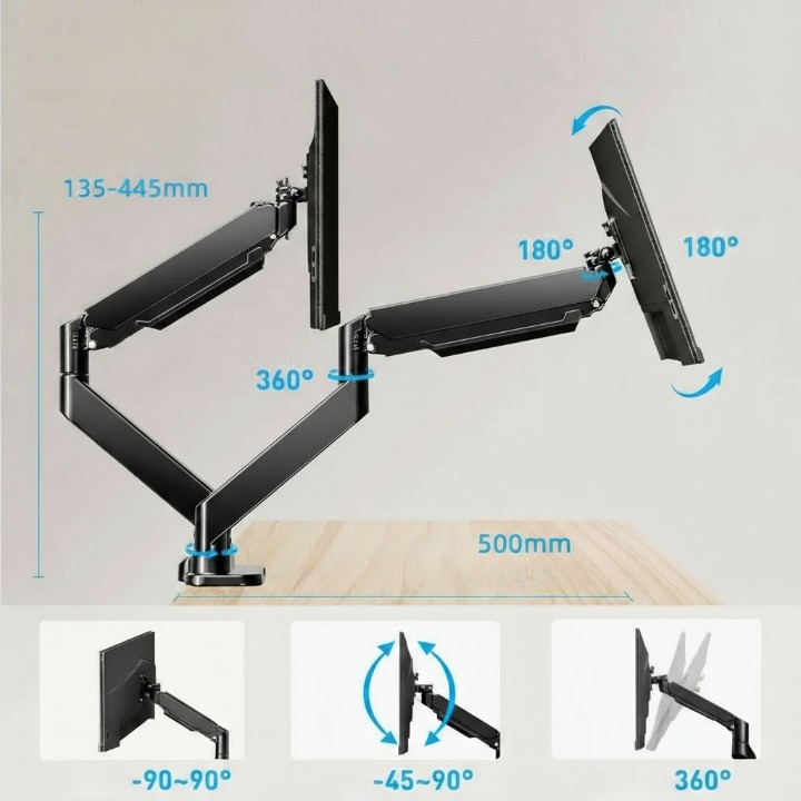 Avec ses bras articulés indépendants, le Support Double Écran permet d’incliner, pivoter et ajuster la hauteur de chaque moniteur selon tes besoins. Idéal pour les professionnels, les gamers et les créateurs, il offre une rotation fluide et une personnalisation complète de ton setup.